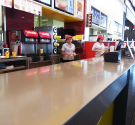 Cubiertas y mesones de atención en Fuente Alemana Colo-colo 550, Concepción por Werner Stehr arquitectos, diseño por Armstrong-Spoerer.