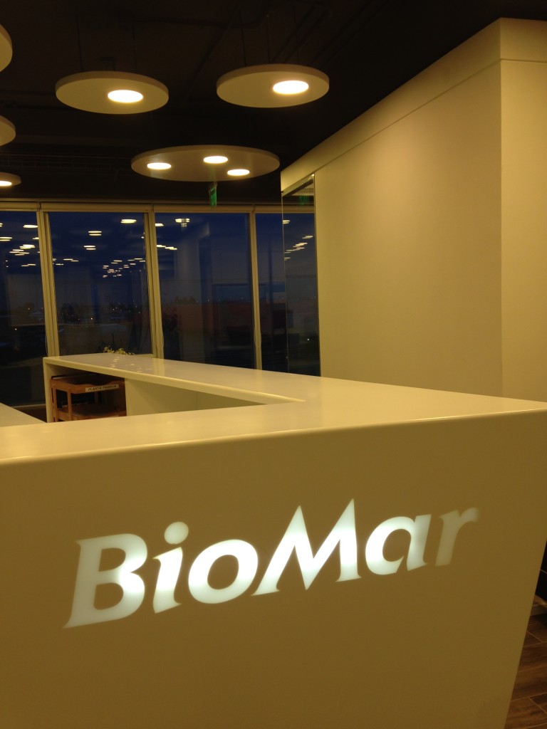 Mesón de Recepción Biomar con detalles de letras insertas por corte de agua, color Dazzlind White, retroiluminadas, Puerto Varas.