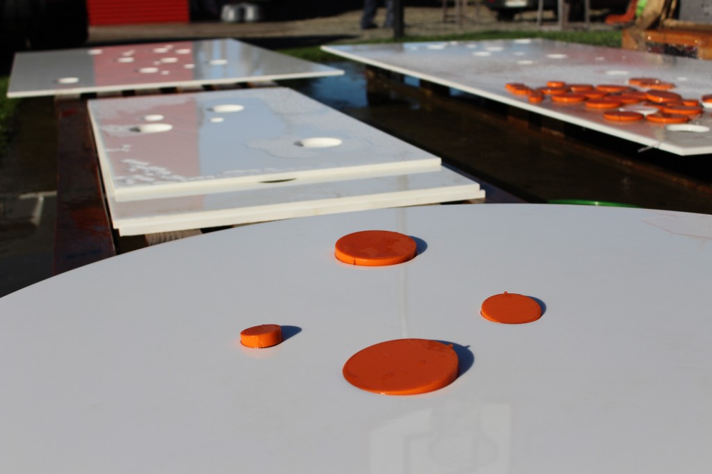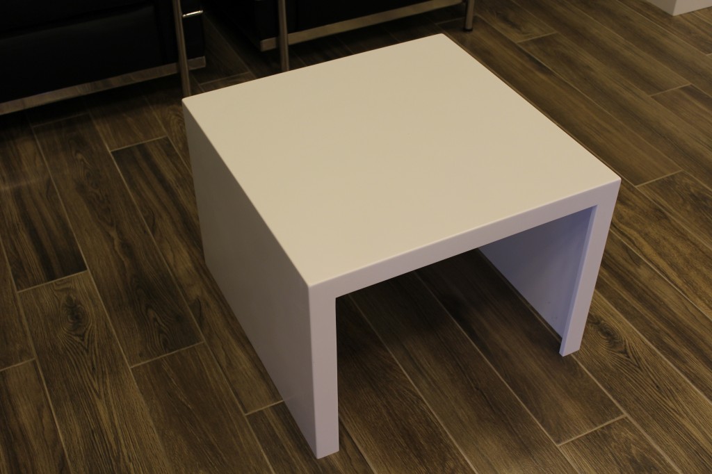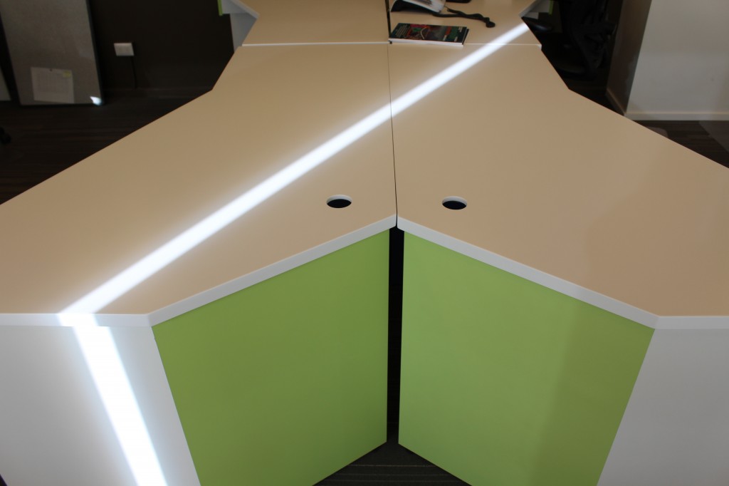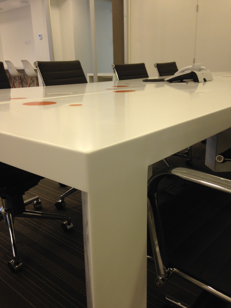 Mesas de reunión para Staron en BioMar, Diseño por Casa Mobili, en Puerto Montt. Proceso de fabricación por corte de agua y termoformado en cantos curvos.