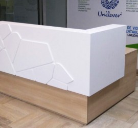 Nombre Proyecto: Proceso de habilitación de Oficinas para SPORT OPTIC, GOPRO, BOLLÉ y GANGSTA. Color Utilizado: Quasar White Descripción: Mueble de recepción y habilitación de oficinas. Fabricante: Ombu Mobiliarios