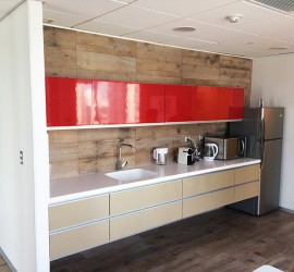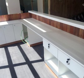 Cubiertas de Staron sobre estructuras montada a muro, en Estaciones de trabajo en empresas BioMar, Puerto Montt. Diseño por Casa Mobili
