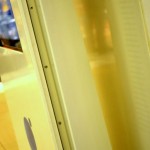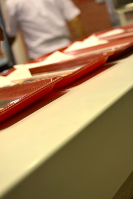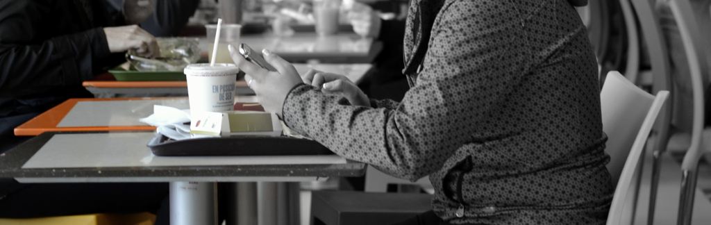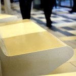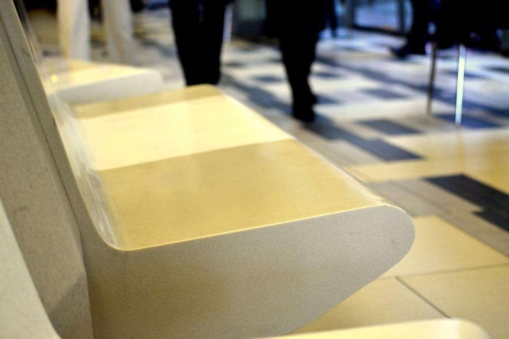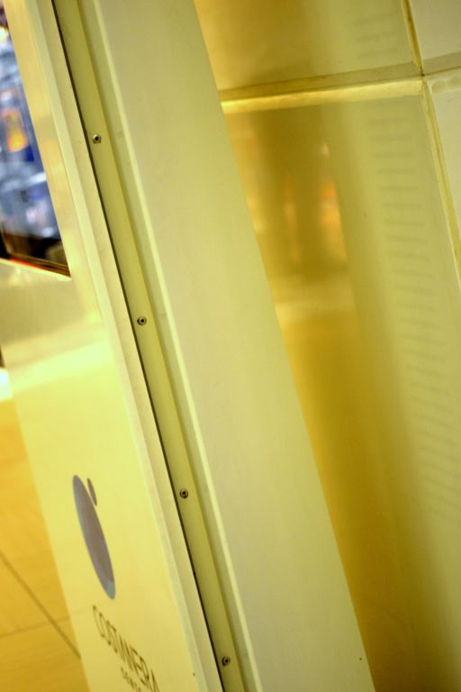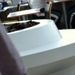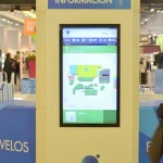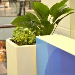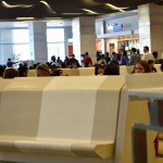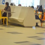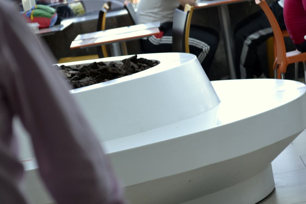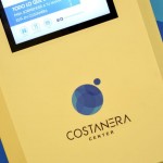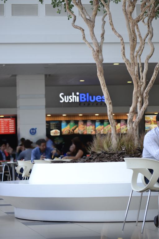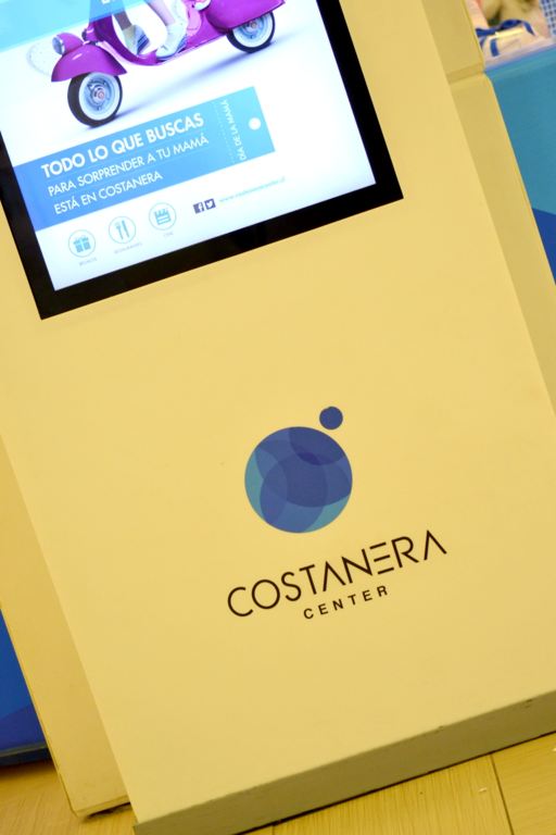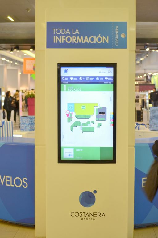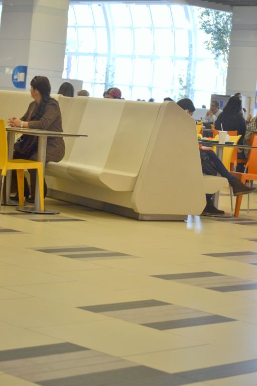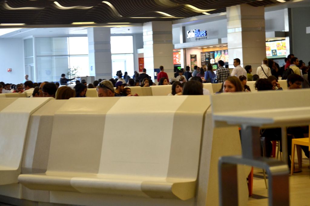 – Mall Costanera Center – totem de Información, mesas, mesones, Asientos y jardinera en patio de comida.